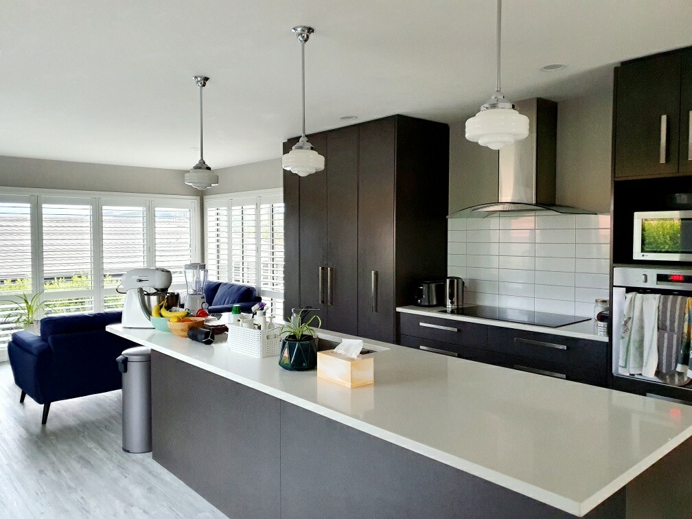 Beautiful 1920s art deco lights installed here over the Kitchen Island boasts a very fashionable vintage meets modern look.